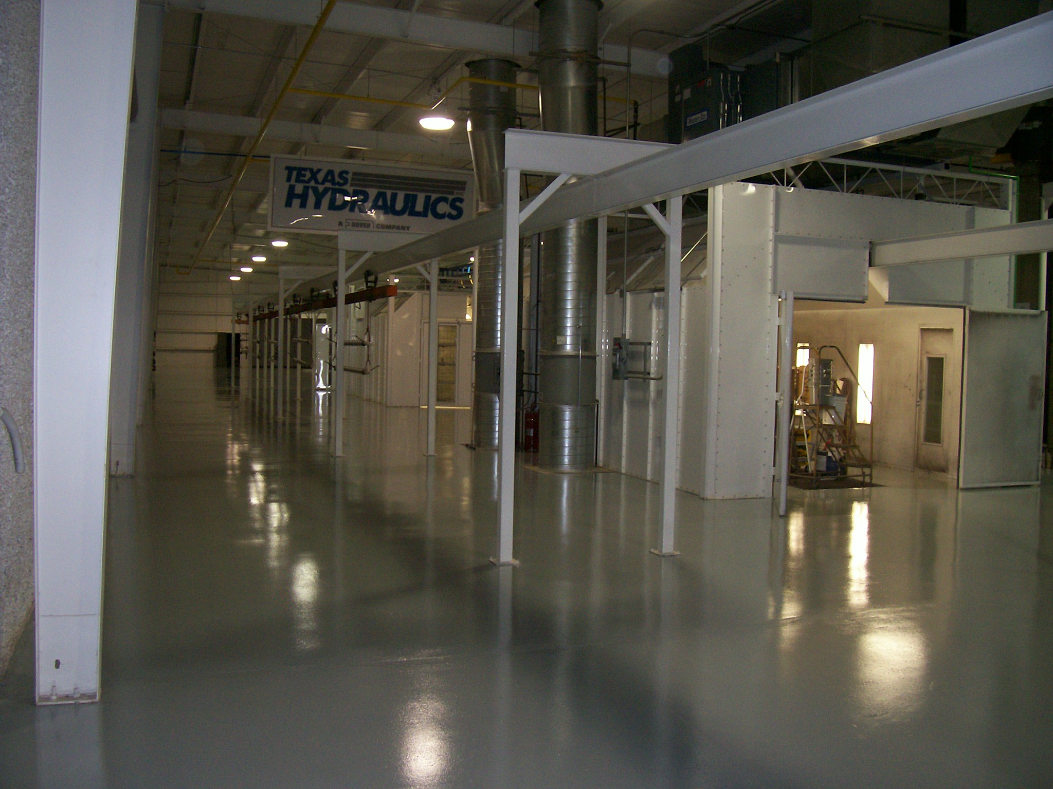 After removing existing coating, patching divots and spalls, and repairing spider cracks in the floor an epoxy coating was applied to the paint booths and the surrounding areas of the plant. A urethane topcoat was then applied to achieve the durability and presentation they desired.
